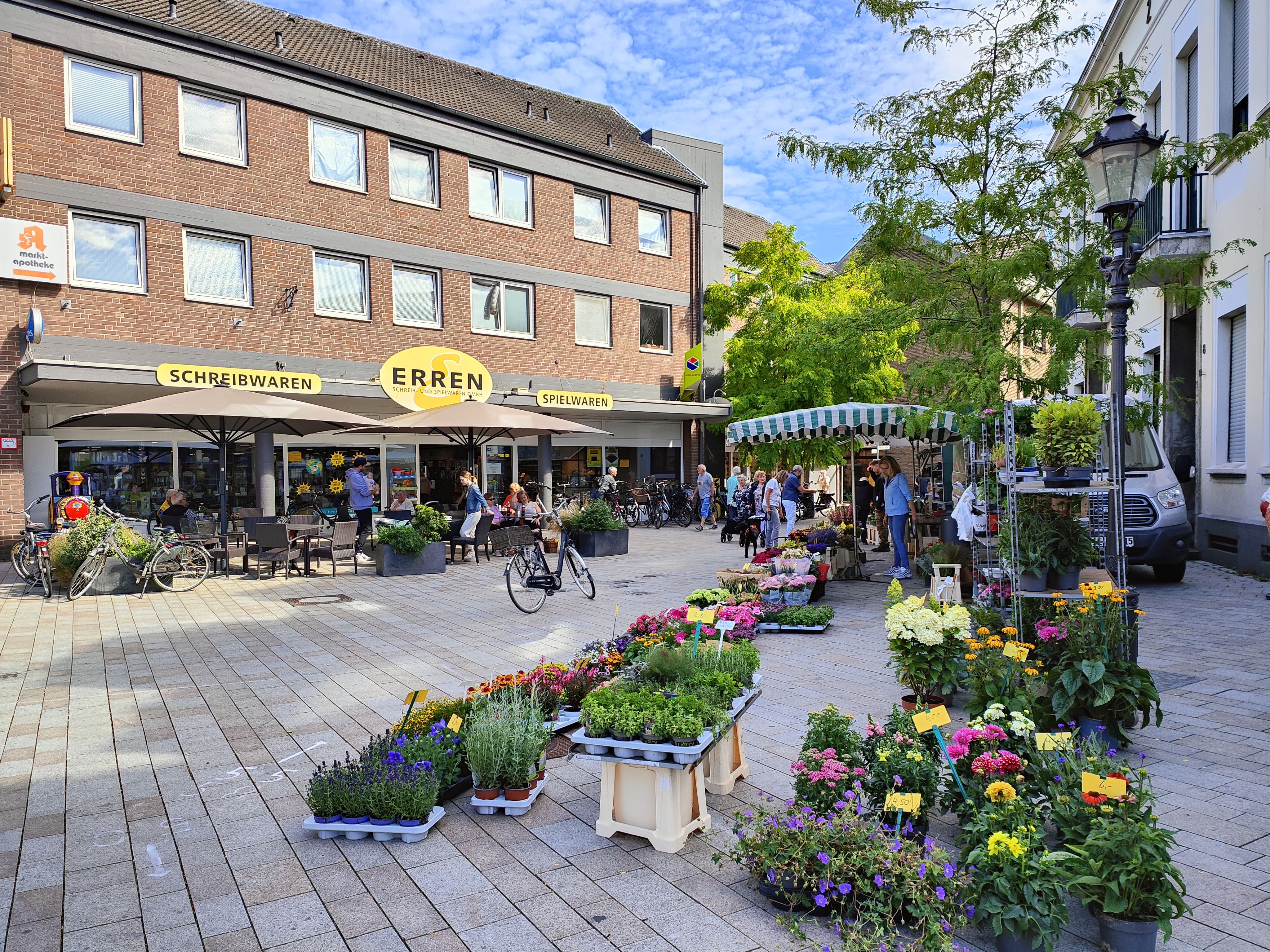 Donnerstags ist in Alt-Willich Markttag! Unser zweites Ausflugsziel ist der Marktplatz rund um die Kirche St. Katharina. Der Wochenmarkt bietet eine breite Auswahl an frischen Lebensmitteln, Blumen, Textilien und Lederwaren.